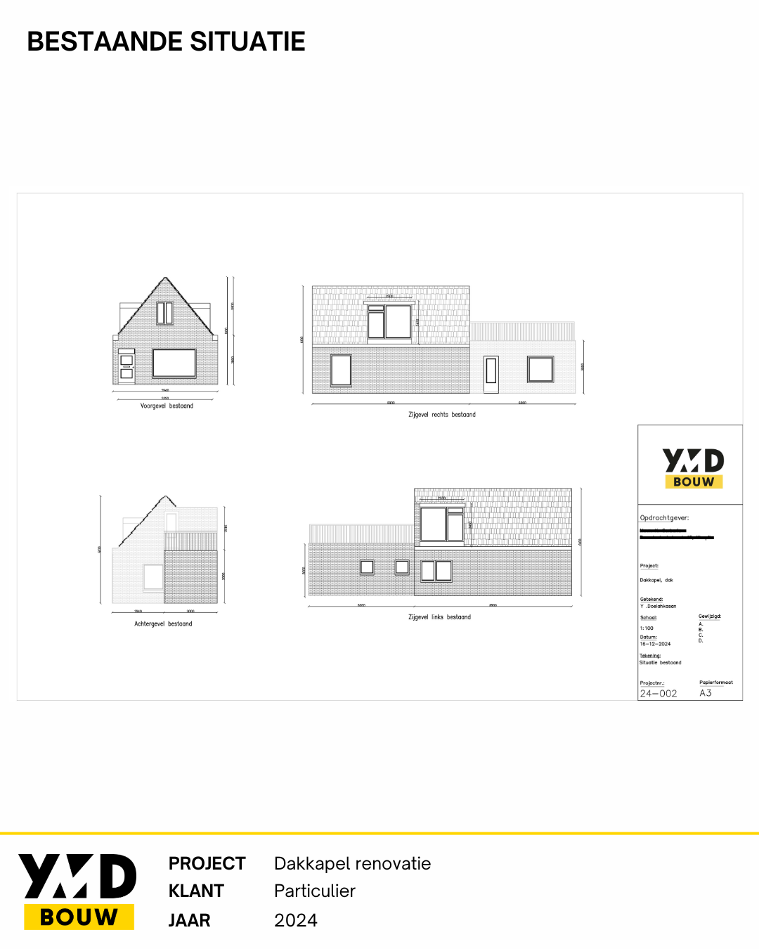 De eigenaren hadden een prachtig woonhuis gekocht en wilden enkele aanpassingen doen om zowel het comfort als de esthetiek te verbeteren. Zij hadden een lopende vergunningaanvraag en moesten aanvullende informatie aanleveren. Hiervoor heb ik de nodige documenten en tekeningen voor opgesteld. In de bestaande situatie had de woning aan beide zijden een dakkapel. De vernieuwde indeling omvatte het plaatsen van een volledig nieuwe dakkapel en het verwijderen van de oude. Daarnaast wilden de eigenaren het dak isoleren en voorzien van nieuwe dakranden en zinken mastgoten.