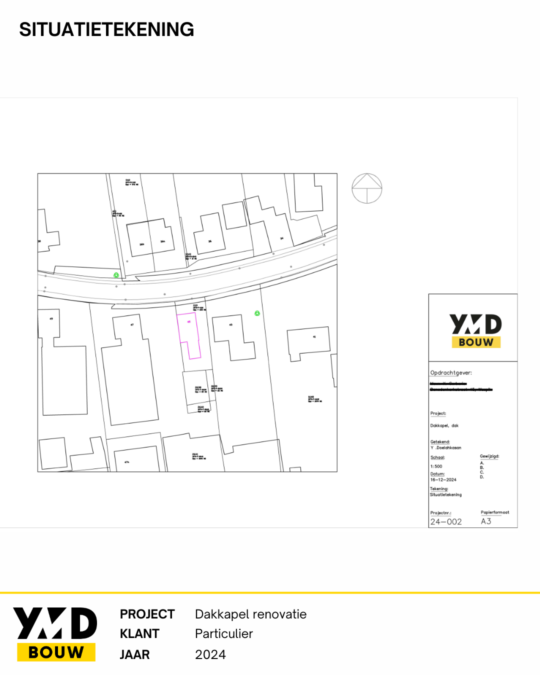 Ik stel een tekening op van het terrein met de aanwezige bebouwing. Dit geeft een helder beeld van de locatie en positionering van de gebouwen op de kavel. Ook de omliggende elementen, zoals wegen, sloten en aangrenzende bebouwing, worden hierin verwerkt. Deze tekening is essentieel voor het aanvragen van een omgevingsvergunning.