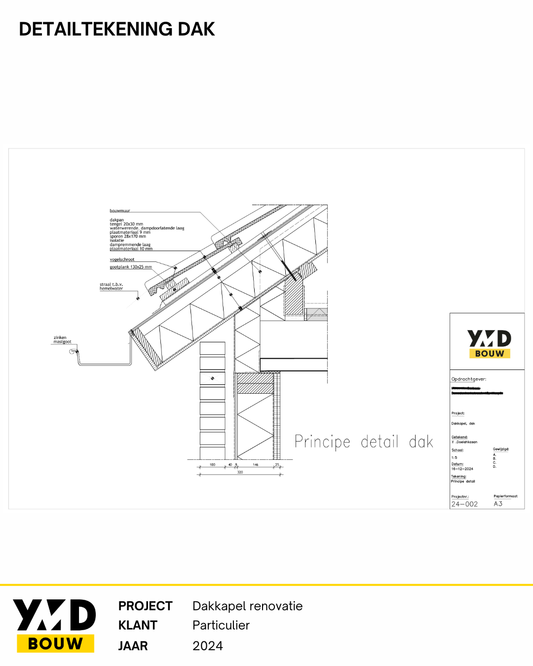 Een bouwdetailtekening is een nauwkeurige technische tekening die specifieke onderdelen van een bouwconstructie in detail weergeeft. Hierop staan onder andere de gebruikte materialen, afmetingen, aansluitingen en constructieve oplossingen. Deze tekeningen zijn essentieel bij het aanvragen van een bouwvergunning, omdat ze aantonen dat het ontwerp voldoet aan de bouwtechnische eisen en regelgeving, zoals isolatie, ventilatie, brandveiligheid en waterdichtheid. De gemeente en andere instanties gebruiken bouwdetails om te beoordelen of het plan constructief en technisch haalbaar is en of het voldoet aan het Bouwbesluit. Omdat het bij dit project gaat om het isoleren van het dak is er een detail van het dak getekend.