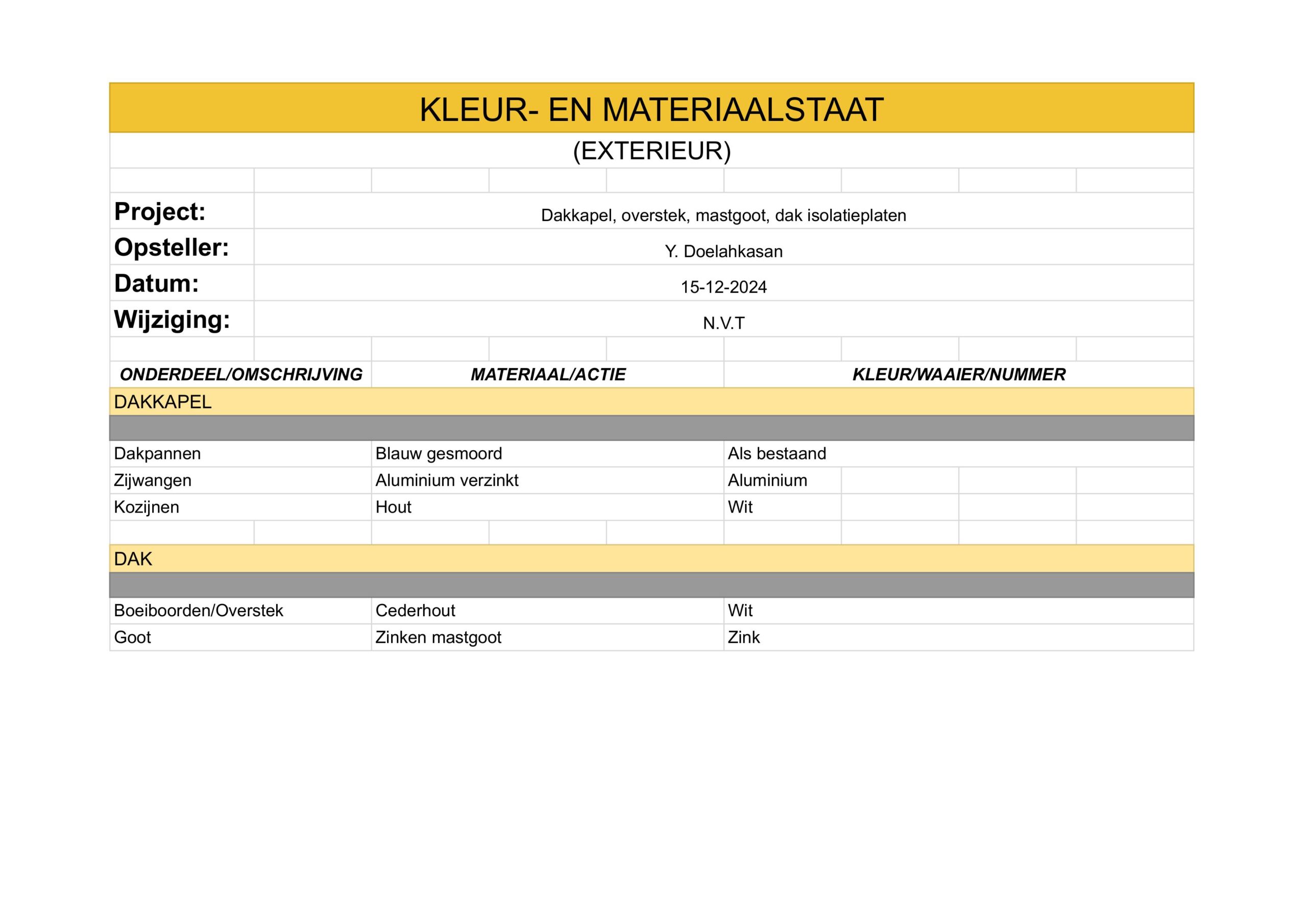 Een kleur- en materiaalstaat is een overzicht waarin de toegepaste materialen en kleuren van een bouwproject worden vastgelegd. Dit document bevat een gedetailleerde beschrijving van gevelmaterialen, dakbedekking, kozijnen, deuren en andere zichtbare bouwonderdelen.